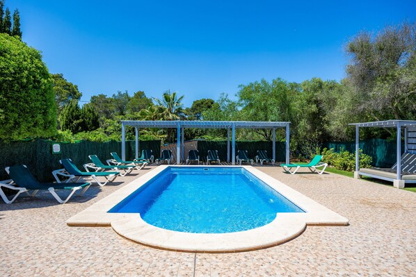 Boasting a beautiful view of the Balearic Sea, the holiday apartment Villa Can Neo is located in Santanyí. The 2-storey property consists of a living room, a kitchen, 7 bedrooms and 5 bathrooms and can therefore accommodate 12 people. Additional amenities include Wi-Fi, a smart TV with streaming services, air conditioning, a fan, a washing machine as well as beach/pool towels. A baby cot and a high chair are also available. Welcome to our vacation rental with an enticing private outdoor space. Take a refreshing dip in the pool, bask in the lush garden, unwind on the open terrace, find shade on the covered terrace, savor grilled delights on the barbecue, and rinse off in the outdoor shower.