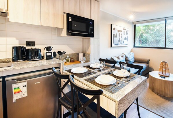 🍽️ Cocina completamente equipada con refrigerador y cafetera