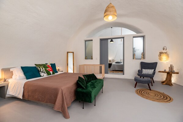 A romantic retreat near Santorini's breathtaking Caldera views where travelers can unwind in a homey atmosphere with authentic Greek charm