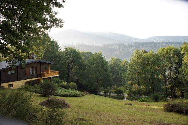 The Ballons des Vosges Regional Park, in a picturesque valley halfway between Gerardmer and Remiremont, The wooden house Paradis is in the middle of nature. The area is beautiful in all seasons and offers various relaxation possibilities: swimming in lakes or rivers in the summer and skiing in winter (La Bresse, Gerardmer). Cycling opportunities within the 80 km-long "Voie Verte" which is 6 km away. The spa town of Plombières-les-Bains is 30 km with four others in a radius of 80 km. Touristic region: Alsace is 5O km, Switzerland and the Jura 110 kms and Burgundy at 200 km. Paradis is a wooden chalet in the middle of a wooded property with a pond (no danger). Wonderful panorama, quietness. Shops and services are 5 km away. Decoration and furniture create a cozy atmosphere. Complete and comfortable equipment. Ground floor: entrance hall, living room with fireplace overlooking a panoramic terrace with fireplace. Kitchen (dishwasher). Room with two beds. Bathroom: sink, show. Beds are made. The bed linen and towels are provided. Free firewood. Week-end or mini-miniweek renting possible. IMPORTANT the chalet offers two rental solutions Envol for 2 people to the exclusion of all other occupants, only the main level, la buandrie and the upper and lower terraces. Paradis is the same structure with all the lower level accessible. Rental is therefore possible on either Envol or Paradis. The 2 structures cannot be combined.