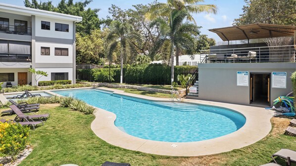 Paradizio is a newly updated complex that is absolutely perfectly located for vacationers. Smack dab between downtown Playas del Coco, the ocean and the great restaurants and shops, this gated complex has more than just location going for it! Enjoy digital entry for enhanced security, a dedicated covered parking spot, and a large pool complete with loungers, a BBQ rancho with an outdoor kitchen, and ample covered seating options for relaxation and leisure. Easily walk to great restaurants, the beach, and downtown. You are also just a 1-minute walk to the town's Sunday artisan market!