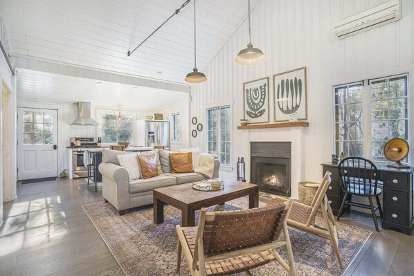 The sleeping spaces are flexible and full of character. The lofted primary sleeping area adds to the cottage's intimate, tucked-away feel, while the separate den with a daybed and trundle provides additional sleeping options for friends, kids, or couples traveling together. The bathroom is a standout feature, designed with stone floors, farmhouse-style lighting, and a classic clawfoot tub—an ideal place to unwind after a beach day or long walk.
