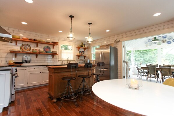 Fridge, microwave, oven, stovetop - This one-of-a-kind two-story home offers a gourmet kitchen with a five-burner (Saugatuck)