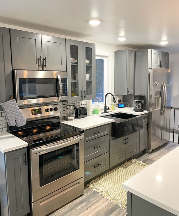The space Fully renovated, our home offers a the perfect mix of comfort, luxury, and restorative charm with amenities including: - Two large living rooms comfortable for bigger groups and families - Three smart TV's in the living rooms and king bedroom - Fully equipped kitchen with a large fridge and freezer, a dishwasher, stove, farmhouse sink, microwave, toaster, coffee maker and kettle. - An eat-in kitchen island and a full dining room. - A pool table, foosball table, and lots of board games for a fun night in. - A lower level master suite with a king-side bed and ensuite bathroom with double sinks. - Two full bathrooms to comfortably accommodate larger groups. - A large washer and dryer available for guest use. - A large yard with a fire pit and deck.
