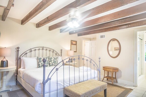 The living area has a full-size sleeper sofa and cable TV, making it a comfortable spot to curl up for some down time. Light and bright, the eat-in kitchen overlooks the courtyard and has a desk perfect for planning out your day. With a tasteful mix of antique furniture, a cast-iron queen-size bed, and en suite bath with walk-in shower, the bedroom is a secluded retreat for two.