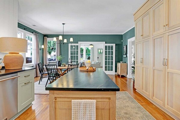 Step inside to discover a warm, light-filled interior with an open-concept living and dining area designed for connection and comfort. The chef's kitchen is a showstopper, outfitted with custom Shiloh cabinetry, rich soapstone countertops, high-end Fulgor Milano appliances, and all the cookware and pantry essentials you'll need to prepare meals with ease. Enjoy your morning coffee at the breakfast bar, or dine together in the elegant dining room.