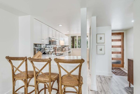 Guests enter on the middle floor of the 3-story condo. The fully updated galley kitchen is on the right with marine blue subway tile, solid surface countertops & stainless steel appliances. The kitchen is fully stocked with all one needs to whip up a stay-at-dinner or reheat your local takeout.