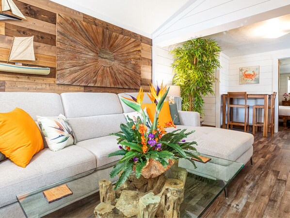 The tastefully appointed living area welcomes you with beautiful natural wood details, and a nautical-themed decor, complete with shiplap walls. The living area includes a comfortable sofa and a large flat-screen TV. Enjoy your meals at the bar-height dining table for two. The custom-designed kitchen includes a refrigerator, stove and oven, and microwave (no dishwasher). The all-new kitchen and bathroom have custom ocean pebble tile accents with natural wood and copper sinks. The bathroom has a glass surrounding walk-in shower, which gives this space a spa-like, relaxing feel. The bedroom is tucked in the back of the apartment and is furnished with a luxurious King-size Sleep Number bed, for the perfect night's sleep.