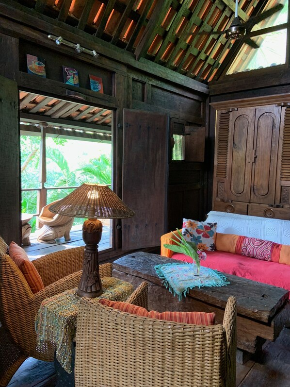 This is a house with character--a 100 year old Balinese teak house and casita perched above papalillo trees and palms, with a view of Monkey Mountain. The two bedrooms consist of 1 king bed, one queen, and there is a Bali bed in the living room, for a smaller person. The deck overlooking the jungle has two daybeds to relax, read and watch the amazing birds.