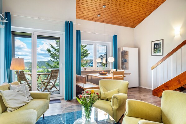The holiday apartment Himmelblau is located in Schönwald and is perfect for an unforgettable holiday with your loved ones. The 2-storey property consists of a living room, a kitchen, 2 bedrooms and 1 bathroom and can therefore accommodate 5 people. Additional amenities include high-speed Wi-Fi (suitable for video calls) with a dedicated workspace for home office, a TV, a washing machine, a dryer as well as children's books and toys. In addition, a private sauna is available for your use. This vacation rental features a private balcony for evening relaxation and a heated indoor pool for shared enjoyment.