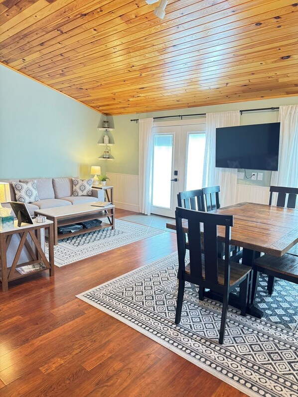 Bedrooms & Layout This charming second‑floor home features 2 bedrooms and 1 full bath: - Primary Bedroom: Bright and airy with a comfortable queen bed. - Second Bedroom: Cozy and well‑appointed with a twin‑over‑full bunk bed plus a pull‑out twin trundle—ideal for families. Each bedroom includes its own Smart TV, closet, and dresser for easy settling‑in. The home’s open‑concept living area offers plenty of room to relax, with a large sectional sofa, six‑person dining table and the fully equipped kitchen has everything you need to prepare delicious meals and feel right at home.