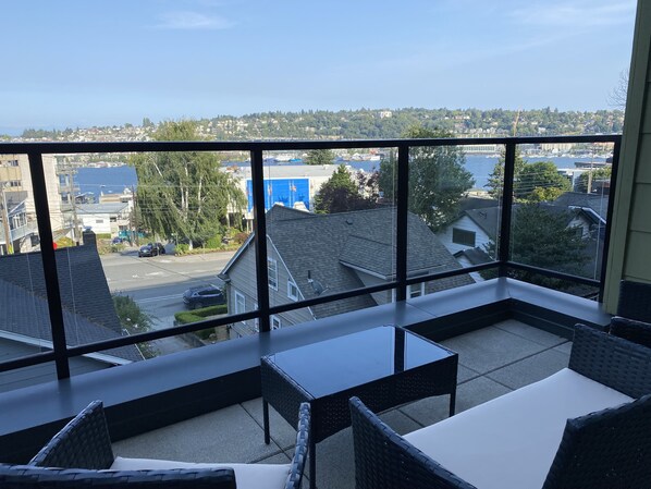 Quiet but close to the city! Lake Union views from your private outdoor patio and rooftop deck. Free parking in onsite secure garage. Near grocery and bus line. Fireplace, fast WiFi, and 65" Smart TV for your entertainment. Welcome to Emerald Vista Seattle!