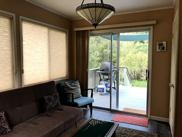 Adorable two-bedroom, solar-powered cottage in Oak Creek Canyon, just steps away from a PRIVATE stretch of Oak Creek and 15 minutes drive from the town of Sedona with high-speed STARLINK internet. Well-behaved pets (furry family members) are welcome. 30 day rental required. Oak Creek Canyon Cottage is a 1960s bungalow located in lower Oak Creek Canyon, one mile south of Slide Rock State Park on highway 89A and 5 miles north of downtown Sedona. Because it is located in a lightly forested section of Oak Creek Canyon at 5000 feet in elevation, the cottage is a lovely, mild spot in which to spend the winter, and a shady, cool spot to beat the heat in the summer. Oak Creek itself is just across the street, so you can take a folding chair down to sit on the banks and enjoy the water, fish and birds. The cottage is furnished with a queen bed, a full XL (long) bed, a cot you can use in the living area, and is decorated with eclectic art, featuring regional artists. Internet service is provided to the cottage by STARLINK and supports video streaming and remote work. There is a small, but fully equipped kitchen, a dining area, and a back deck where you can eat outside or hang out and watch the humming birds. Other amenities include laundry facilities and a new tub/shower, yard games, and a BBQ grill. The garden is filled with fragrant flowers in the spring and summer and offers a variety of fruit bearing trees in the late summer and fall. There is a hiking trail (Sterling Pass) just a quarter mile from the house, and many, many more hikes in the nearby area. This is a wonderful place to use as a base to explore all that Northern Arizona has to offer: it is 40 minutes to Flagstaff, 1 hour to Jerome, and 2 hours to the Grand Canyon, just to mention just a few of the fantastic destinations within easy driving distance. Note: Because of the house's location, there is some road noise during the day --- but it is very peaceful at night when the day visitors go home!