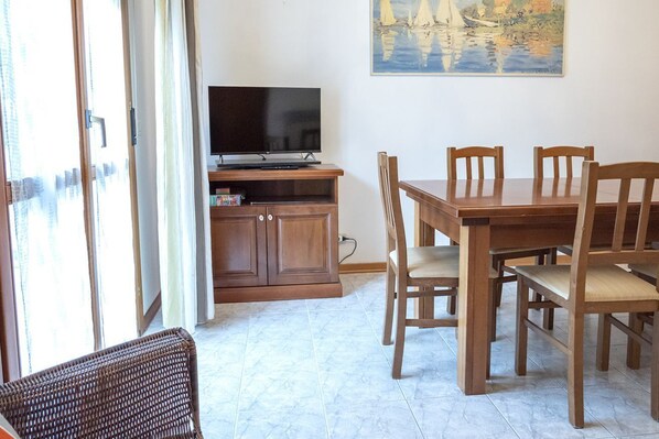 Description: three-room apartment located on the ground floor with comfortable outdoor spaces. Entrance to living area with dining table, armchairs and equipped kitchen - bedroom with double bed - second bedroom with two single beds (second double if necessary) - bathroom with tub with shower - large tiled terraces on the front and back equipped with table and chairs. Washing machine. Air conditioning in the living area. Wi-Fi. Free parking space on the street.