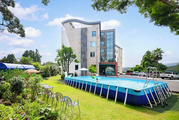 Families can relax on beautiful grounds surrounded by nature or enjoy the seasonal pool at this welcoming retreat in Seogwipo City