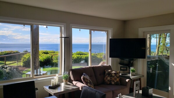 Perched on a bluff overlooking the Strait of Juan de Fuca, we’re right next to Panorama Vista County Park, where a short path leads to a set of wooden stairs descending to a secluded beach. Explore in either direction and often feel like you have the place to yourself. From the bluff (or the beach) you can see the outline of the San Juan Islands and Vancouver Island (B.C.) in the distance. You have the Olympic mountains to your left and Protection Island to your right, with an occasional view of snow-covered Mt. Baker beyond that on a clear day.