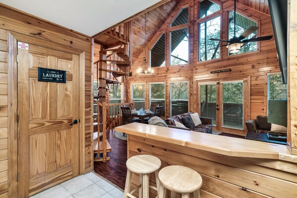 Main Level: The heart of the cabin offers a warm and inviting living room, a fully equipped kitchen including a standard coffee maker, for home-cooked meals, a full bathroom, and a bedroom outfitted with a king-size bed. It`s a comfortable setting for gathering and creating lasting memories.