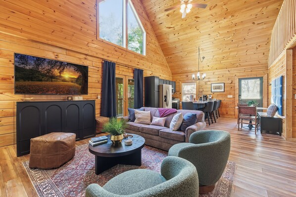 With mesmerizing views of the Smoky Mountains, this is where you will want to spend most of your time. The deck features a multi-functional grilling station where you can cook up delicious steaks or burgers on the grill; eggs, bacon and pancakes on the griddle; or homemade pizzas in the pizza oven. Gather around the new dining table with stools while listening to the sounds of the forest. When it's time to wind down, relax in the lounge chairs with a glass of wine or Kentucky bourbon, or soak in the hot tub under the glow of the string lights.