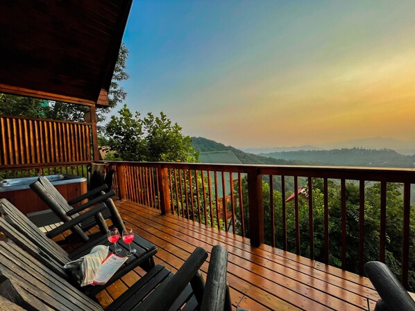 Private outdoor hot tub with mountain views and gorgeous sunsets.