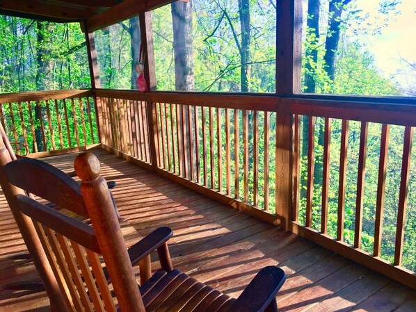 Lazy Days are here again! This is a thoughtfully laid-out cabin on a scenic ridge for couples or families. Enjoy nature on one of two decks looking across the valley with a full kitchen, gas grill, coffee maker. Dine, rock or hot tub it on the screened-in main deck. There are 3 TVs, Roku+Sling channels on each TV, super fast AT&T Fiber / wifi internet and a cozy gas fireplace. There is 1 King, 1 Queen, 2 built-in Twins.