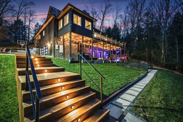 Step outside to your private sports complex: shoot hoops, play volleyball in the sand, or play pickleball on the driveway. Take the paddle boat out for a float, then enjoy s’mores around the modern fire pit as the sun sets over the Smokies.
