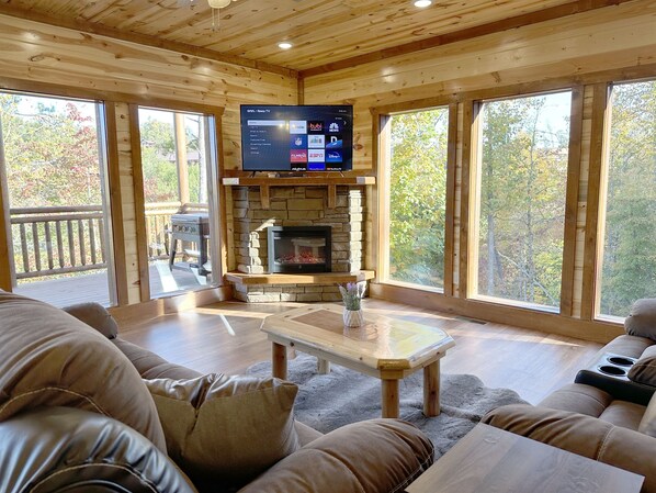 - Living room with indoor fireplace, large TV, and views of the mountains beyond