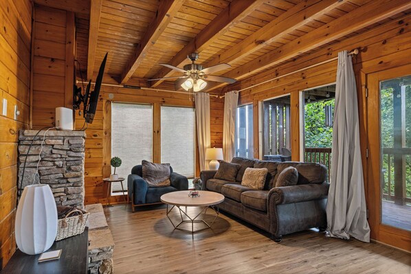 SLEEPING ARRANGEMENTS: The cabin can sleep up to 6 with 2 king suites, one on the main level with a tub/shower combo and one on the top level, with a tub/shower combo, and a queen sleeper sofa in the living room. We also provide a pack-n-play. With 2 levels, there is room for everyone to spread out and a full bath on each level.