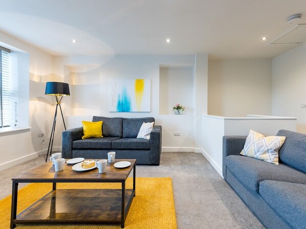 Upstairs there is an open-plan living area, tastefully furnished with modern décor and space perfect place to relax and unwind after a day of exploring the charming town of Shrewsbury. Our TV has a Fire Stick but does not offer Freeview TV.