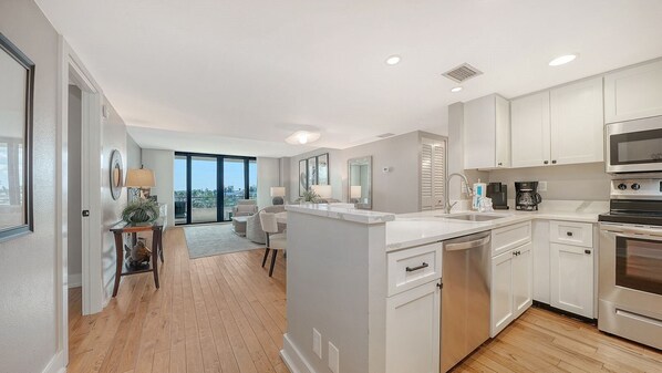 As you enter the condo, your eye is immediately drawn to the bright and cheery living space and ...wall of sliding glass doors that open up to the balcony. Southern exposurebathes the condo in sunshine through large sliding glass doors in each room. The sliding gass doors open to create an indoor/outdoor living space where you can relax with picturesque views of the Intercoastal Waterway and the Gulf of Mexico. Prepare your favorite meals in the fully stocked kitchen connected to the living space. The large master suite boasts an ensuite bathroom with separate dressing area, walk-in closet and balcony access. The spacious guest bedroom also has a walk-in closet and balcony access. Complementary Wi-Fi is provided in the condo and through out The Anchorage complex.