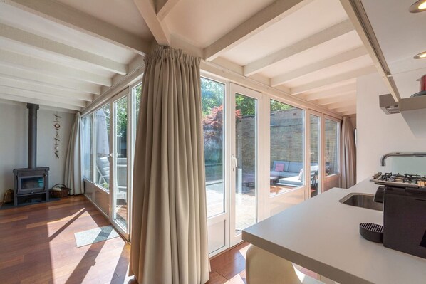 Layout: Ground floor: (Living room(TV(flatscreen), seating area), open kitchen(dining table, hob(4 ring stoves, gas), electric kettle, toaster, hood, coffee machine(cups, espresso, filter), oven, microwave, dishwasher, fridge, dishes and cutlery(Bowls, chopsticks, plates, cups, etc.), Cooking basics(Pots and pans, oil, salt and pepper)), bedroom(double bed), bathroom(shower, washbasin, toilet), toilet(toilet), Internet access) stove(wood), washing machine, heating(central), terrace, garden, garden furniture, parasol