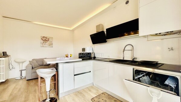 Discover the charm of Sirmione by staying in our modern two-room apartment, located in a residence surrounded by greenery just a short walk from the center. This cozy first-floor apartment is the perfect retreat for a relaxing vacation on Lake Garda.Upon entering, you will be greeted by a bright living room equipped with a comfortable sofa bed and a well-equipped kitchenette, complete with peninsula and dishwasher, ideal for preparing your meals in total comfort. The master bedroom overlooks the terrace; the latter offering a lovely view of the residence's swimming pool.The spacious terrace, furnished with an outdoor table, is the perfect place to enjoy outdoor breakfasts or dinners under the stars, surrounded by the tranquility of the condominium garden. Air conditioning provides a cool and comfortable environment during summer days, while private Wi-Fi allows you to stay connected at all times.Facilities also include a washing machine for your convenience, ensuring that you have everything you need for a worry-free stay. The central location allows you to easily explore the sights of Sirmione, from stores and restaurantsCIR: 017179-LIM-00181