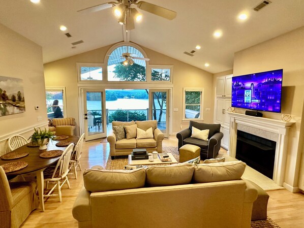 📍 Open-concept living area perfect for entertaining. An inviting upper patio with glass walls to safely and fully enjoy the spectacular views sitting on new, comfortable patio furniture while relaxing and watching the sunset over the mountains. The screened in lower porch has hammock chairs and new, foldable ping pong table. It is the perfect place to lounge and relax while conforming to the “Lake Life”. There are newly purchased, large, wall mounted flatscreens with Roku, televisions in both dens and every bedroom (including bunkbed rooms), surround sound in both dens, along with plenty of activities for the entire family.