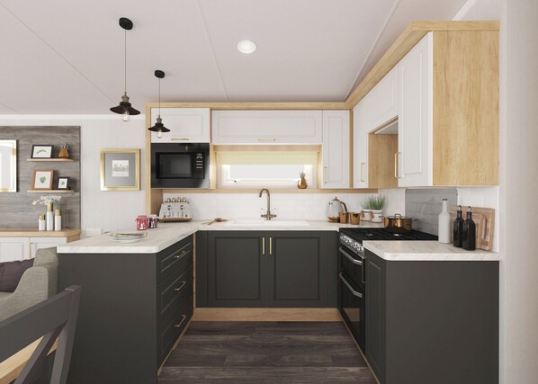 Flatscreen TV, shower, additional sleeping for two in the lounge area, kitchen including gas cooker, microwave and domestic fridge/freezer, and gas and electricity included. Bed linen included. Heating: Electric fire to the lounge, domestic central heating and double glazing. Access: 3 steps with handrail, front patio doors have enclosed decking.