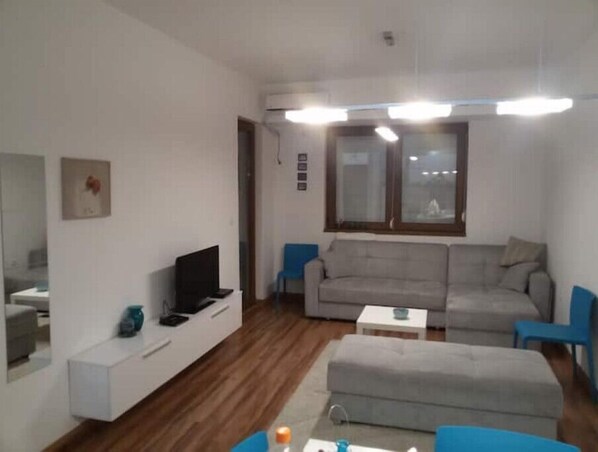 In a quiet neighborhood, this 7th-floor apartment offers a peaceful retreat near the city center. Unwind on the spacious balcony with a coffee table and chairs, or explore local Macedonian cuisine at nearby restaurants.
