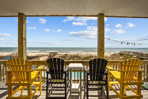 Start the day with a breathtaking sunrise over the ocean. Take your morning coffee on one of the home’s large decks, or in the sitting areas of the two spacious top-floor ocean-facing bedrooms. Settle into breakfast outside, overlooking the pool and beach.