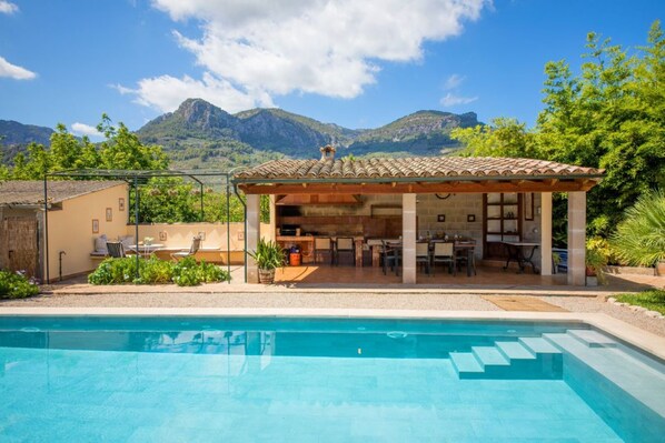 Nestled within Mediterranean greenery, Villa Rae is located in Sóller and perfectly combines modernity and rustic charm. The 3-storey cobbled house with a mountain view consists of a living room, a well-equipped kitchen with a dishwasher, 4 bedrooms as well as 3 bathrooms and can therefore accommodate 8 people. Additional amenities include Wi-Fi, a washing machine, fans, satellite television, a baby cot and a highchair. In your private outdoor area, you will find a beautiful garden with palm trees, 2 terraces (open and covered), a barbecue, a pool and a table tennis table. Your covered terrace, which is equipped with a table and chairs, a worktop and sink, invites you to enjoy delicious barbecued meals together with your loved ones while you overlook the garden. Due to its excellent location, shops, bars, restaurant and cafes can be reached on foot in less than 7 minutes and the nearest supermarket is located just a 6-minute walk away. Furthermore, Port de Sóller is a 9-minute drive away (4.5 km) and Platja de Traves beach, with its soft, white sand, is a 6-minute drive away (3.8 km).