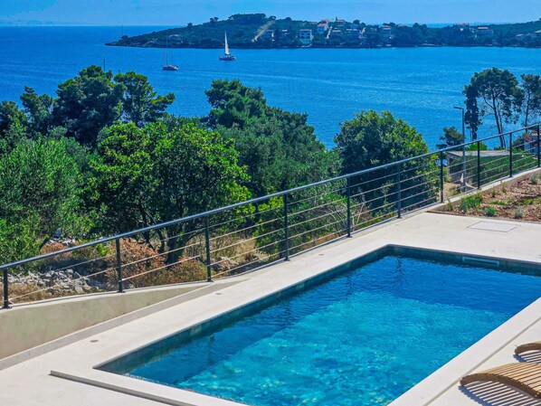 Single-family house "Sova", 2 storeys. 2.5 km from the centre of Grohote, in a quiet, sunny position, 200 m from the sea, 200 m from the beach, in a cul-de-sac, in the countryside. Private: property 500 m2, garden 20 m2, swimming pool angular, heated (7 x 3 m, depth 150 cm, seasonal availability: 01.May. - 01.Oct.) with internal staircase. Outdoor shower, boules, terrace (50 m2), garden furniture, barbecue, pool maintenance by the owner/gardener. In the house: internet access, table tennis, washing machine, tumble dryer. Parking (for 2 cars) at the house on the premises. E-charging station. Supermarket 2.5 km, restaurant 2.5 km, bakery 2.5 km, bus stop 2 km, pebble beach 450 m, rocky beach 200 m. Marina 2 km. Swimming pool heated (extra). ,It is necessary to announce 7 days in advance if the heating is required. 5-room house 100 m2 on 2 levels, east facing position. Living/dining room with satellite TV (flat screen), air conditioning. Exit to the terrace. 1 room with 1 french bed (160 cm, length 200 cm), shower/WC and air conditioning. 1 room with 2 beds (90 cm, length 200 cm), shower/WC and air conditioning. Open kitchen (oven, dishwasher, 4 ceramic glass hob hotplates, toaster, kettle, microwave, freezer, electric coffee machine). On the lower ground floor: living room with satellite TV (flat screen). 1 room with 1 french bed (160 cm, length 200 cm), shower/WC and air conditioning. Sep. WC. No heating option. Terrace 32 m2, roofed. Terrace furniture, deck chairs. Beautiful view of the sea. Facilities: hair dryer. Internet (WiFi, free).