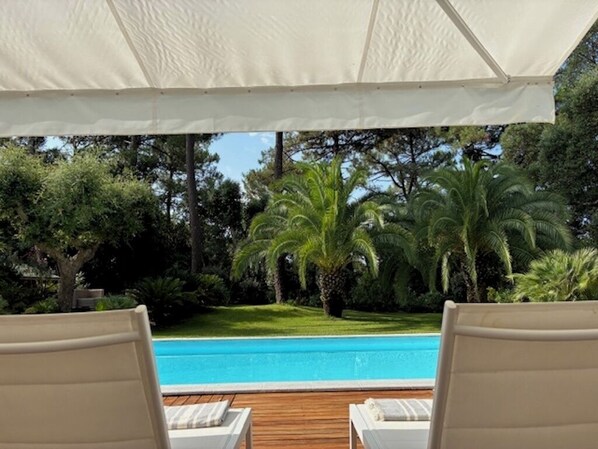 In the landscaped garden, a beautiful heated pool is surrounded by a large wooden sun terrace and 2 covered terraces sheltering outside the kitchen dining area, lounge and grilled appetizer and away the relaxing reading area (over 100m 2 terrace).