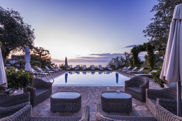 The shady winding path that goes from the villa to the best view point of the property leads to a splendid swimming pool, surrounded by flowers and facing the Island of Capri on the horizon.