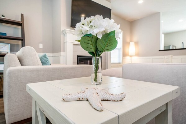 As you step inside, you'll be greeted by an inviting and open living space, complete with comfortable seating, a Large Sony Smart TV with Wide Viewing Angle and a cozy fireplace. The fully equipped kitchen includes high-end cookware, crystal wine glasses, fine china dinnerware and lots of kids plates and cups.  In the kitchen you will find a breakfast/coffee area stocked with Nespresso, Keurig, Cuisinart Drip Coffee Makers and even a commercial waffle maker!  Adjacent to the kitchen is the ultimate relaxing sunroom!  The sunroom boasts plenty of luxury and comfort to sit, relax and take in the views.  The kitchen is perfect for preparing meals and snacks, but most importantly, it's a place where family and friends can gather to have that memorable summer dinner together!