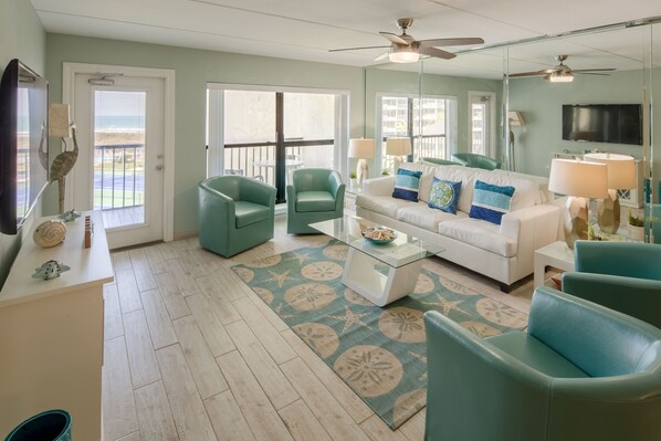 The living room features new tile floors, beautiful tropical furniture that exudes casual elegance. Look out the wall to wall expansive windows onto the Gulf or step onto the balcony of the pent house for a closer look of the beach and the waves.