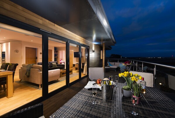 This ground-floor property offers beautifully furnished open-plan living. In the sitting area, you'll find two comfortable sofas, a wall-mounted television, a DVD player, and an Apple AirPort Express integrated hi-fi system. The space is further enhanced by a contemporary wood-burning stove, creating a cosy ambience on cooler evenings. The dining area features a dining table and comfortable seating for up to four guests. The well-equipped kitchen boasts a double electric oven and hob, fridge/freezer, dishwasher, washing machine, and coffee machine. It also features a modern kitchen island and a breakfast bar with additional seating for two. The open-plan living area seamlessly extends outdoors through bi-fold doors, allowing the refreshing Cornish breeze to flood the space. Bedroom two offers twin single beds, while bedroom one boasts a king-size bed and comes complete with an en-suite shower room. An additional family bathroom features a bath, overhead shower, wash basin, and WC for added convenience.