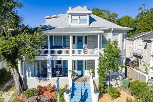 Welcome to the Crystal Room at Southern Wind Inn — a stylish and tranquil hideaway in the heart of historic downtown St. Augustine. This inviting suite features a Queen bed and a cozy Twin daybed surrounded by elegant dark walls, soft pink and blue accents, and plenty of natural light. Perfect for couples or small groups seeking a peaceful retreat just steps from the city’s best cafés, boutiques, and historic landmarks.