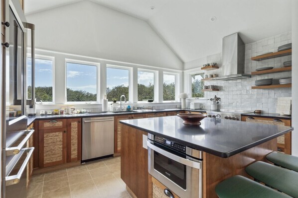 Chef-ready kitchen: Wolf gas stove, double sinks, oven, microwave, and All-Clad® cookware