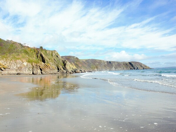 Bedroom 3: Bunk (3ft) Beds (Children Only). Electric storage heaters (underfloor heating in shower room), electricity, bed linen, towels and Wi-Fi included. Travel cot and highchair on request. Bike store. No smoking.. Set just 50 yards from a beautiful , sandy beach with waters that gently shelve out to sea making for safe, pleasurable swimming. A freshwater stream also spills down onto the beach, keeping children endlessly entertained.