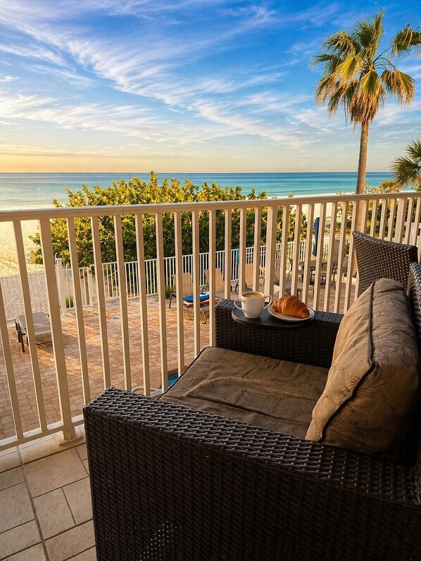 Perched above the Gulf of Mexico, this oceanfront condominium offers a serene escape. Enjoy spectacular sunsets from the balcony and take in the tranquil views of natural sea grass and palm trees that lead to a heated pool area and pristine sandy beach.