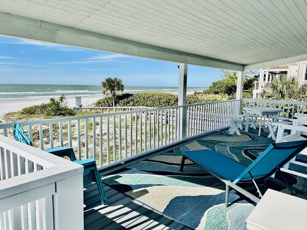 Overall we were somewhat disappointed. First, not having a washer and dryer is hard with children, and definitely shouldn't have to pay extra when you are paying the price to stay already. Read the fine print in the details specifying coin operated laundry off site. The house has obviously been updated but has some uneven spots in the floor, the glass on the living room table was broken when we arrived and a window in the kitchen was cracked. Our biggest issue, however, was the bathroom. Located in the living room/kitchen area it is not very private. The door is a farm house style, sliding door with no lock and large cracks on each side. There are no blinds on the doors facing the beach, allowing anyone to see inside, especially at night. No closets in the bedrooms. Rooms small. First 2 days we had no internet or television, until the cable company came out to fix Monday morning. The views were amazing. Being right on the beach was great, super convenient. Disliked that there is a boardwalk directly beside the property as this made it more public than private as we imagined. Kitchen was well equipped. Amenities provided.Don't get me wrong. We had a wonderful time. Although, driving 12-13 hours and spending thousands of dollars you set certain expectations that aren't always met.