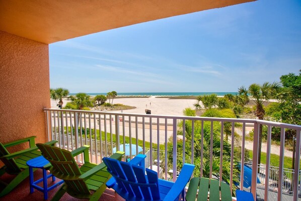 — Fabulous View from the Private Beachfront Balcony. Perfect for Relaxing, Beach Gazing, or Enjoying the Nightly Sunset Show! Overlooks the resort pool in case you need to watch the kids!