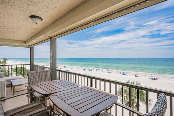 This 3 Bedroom 2 bath condo overlooking the Gulf provides you with water views as far as the eye can see. Enjoy beautiful sunsets from your private balcony. This is a corner unit that offers even wider views of the beach and Gulf looking South both from the balcony and living room. The master bedroom has sliding glass doors out to the balcony as well as a King size bed and TV. There is a King bed in 2nd bedroom, and 2 twins in the 3rd bedroom. This unit has electric hurricane shutters to keep out any weather or provide shade on the balcony. Sand Castle III offers a large, heated pool, hot tub and gas grills for guest use. Assigned Parking.