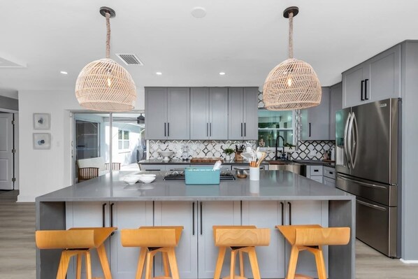 Escape to Coastal Paradise, a modern villa with a spacious open layout and beautiful coastal theme. Unwind in the private heated pool, lounge on the patio set, or relax on the hammock - all just 5 minutes from Madeira Beach. Enjoy family gatherings in the fully stocked kitchen or cozy up by coffee/tea bar.